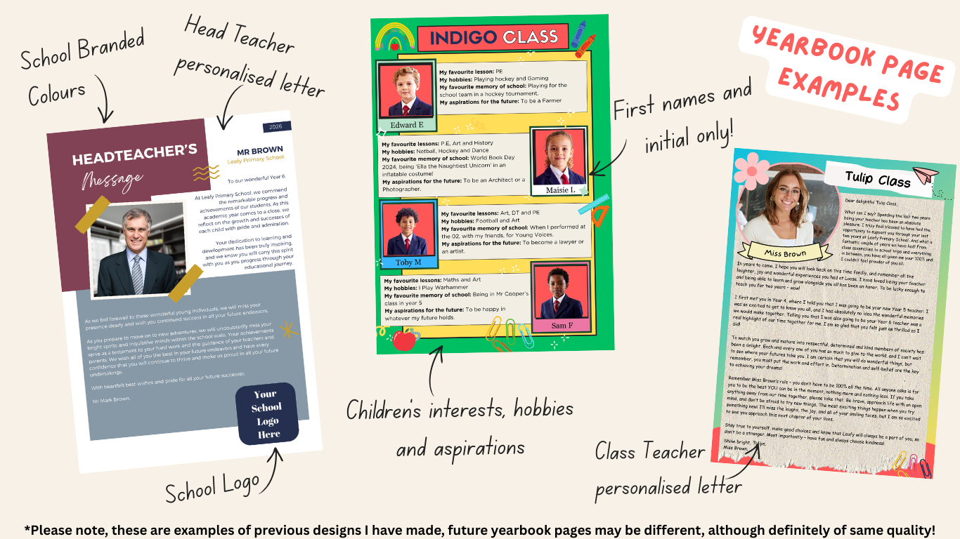 Designed to match your school uniform colours, this is a personalised yearbook, which includes Teacher letters and notes, pupil photos and personalised messages, all submitted by your parents themselves, to create a beautiful yearbook, that both children and parents will cherish forever.